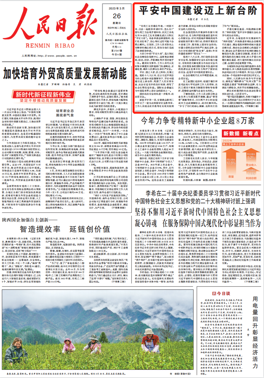2023年3月26日,《人民日报》头版——《平安中国建设迈上新台阶》报道: