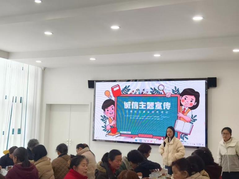 为进一步提高辖区居民诚信意识,营造诚实守信的良好社会风尚,3月5日上午,武汉市汉阳区江堤街江腾社区联合养老服务机构共同开展了“诚信进社区”宣传活动。