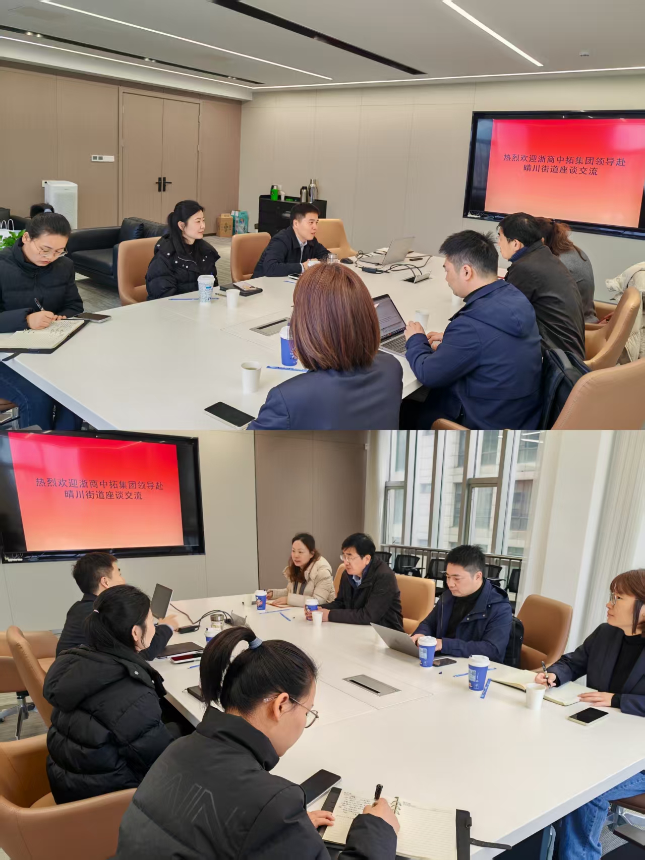 3月2日上午,浙商中拓集团股份有限公司副总经理梁靓一行赴晴川街道座谈交流。街道办事处主任王硕、副主任刘云接待并参加座谈。
