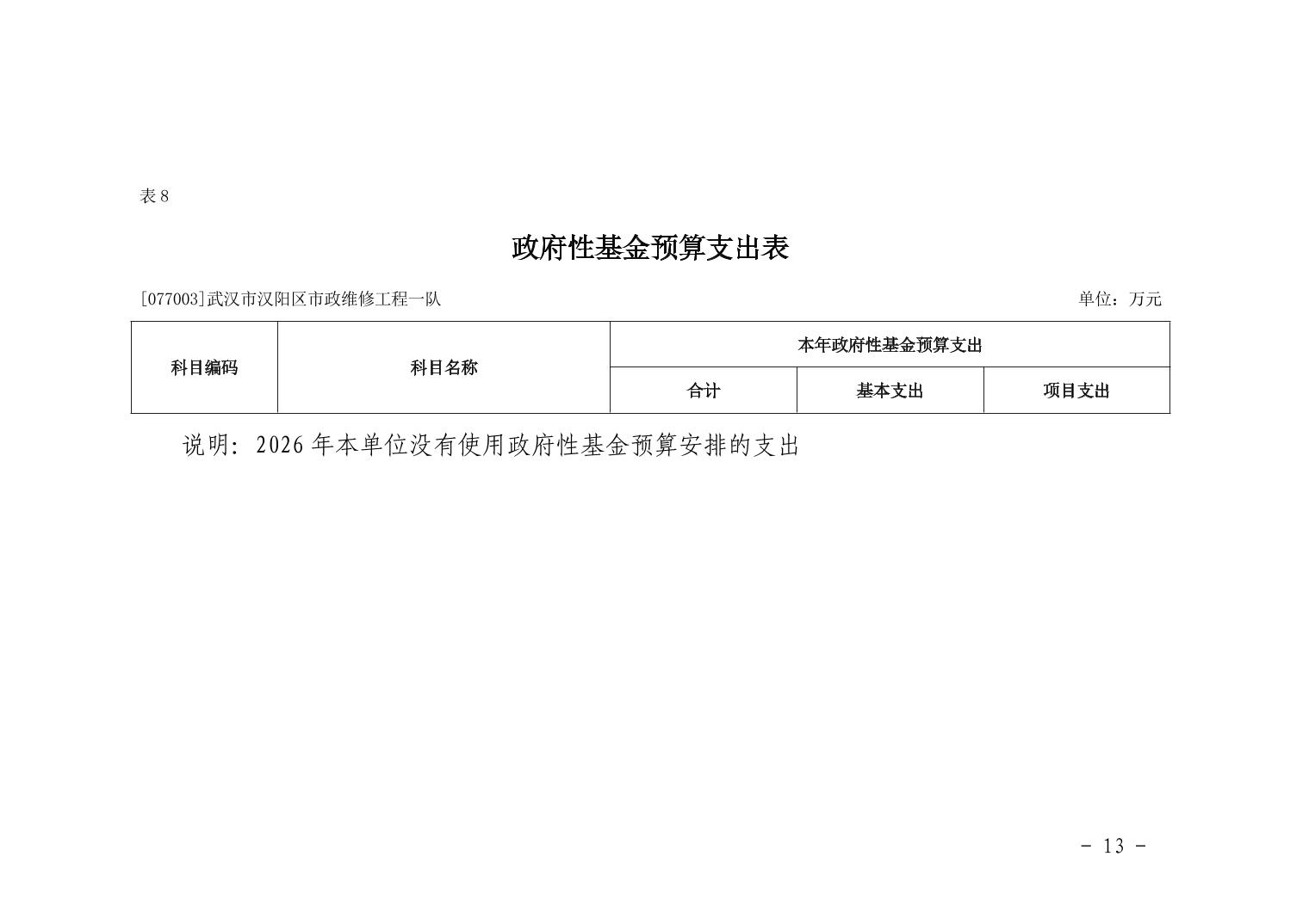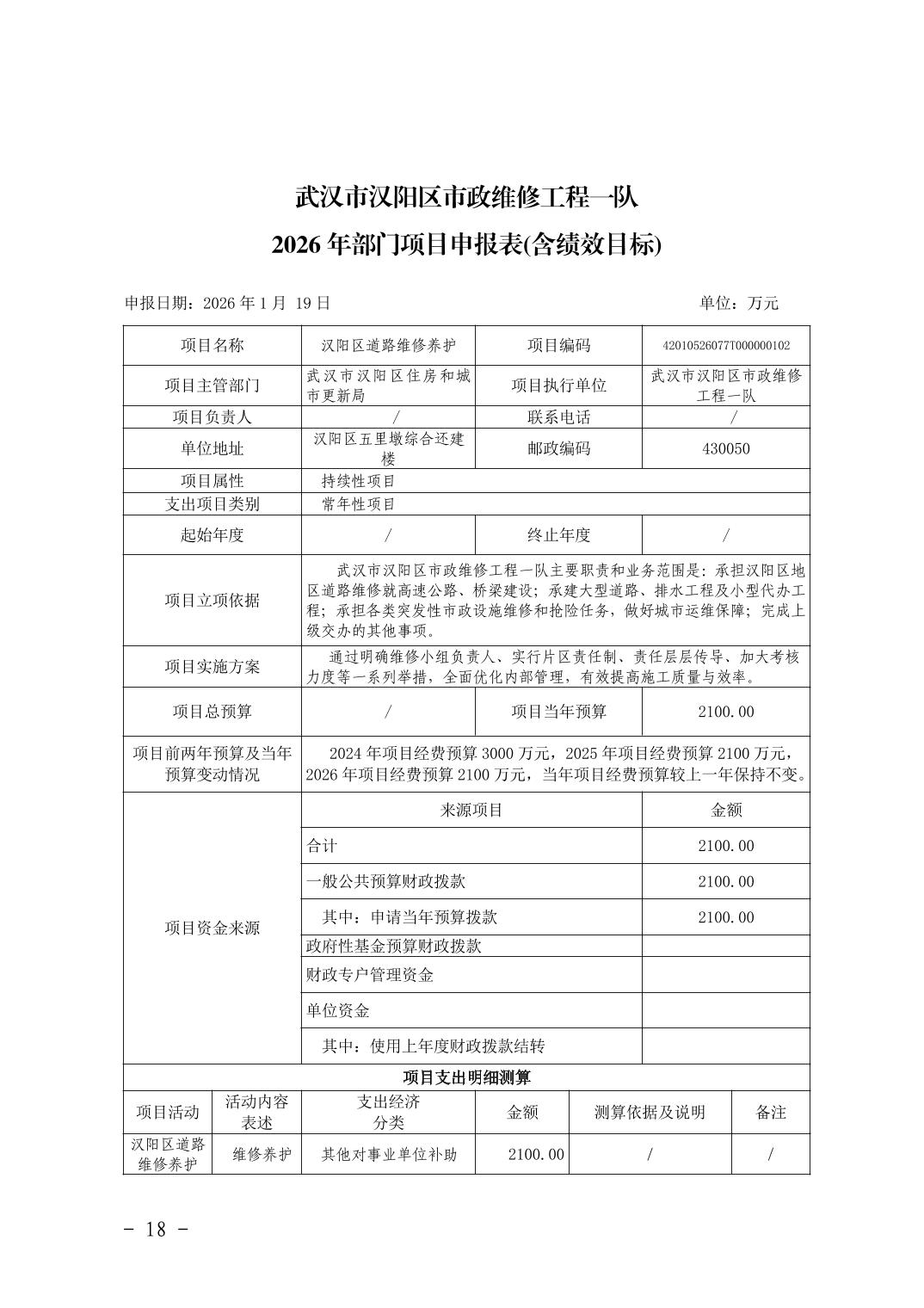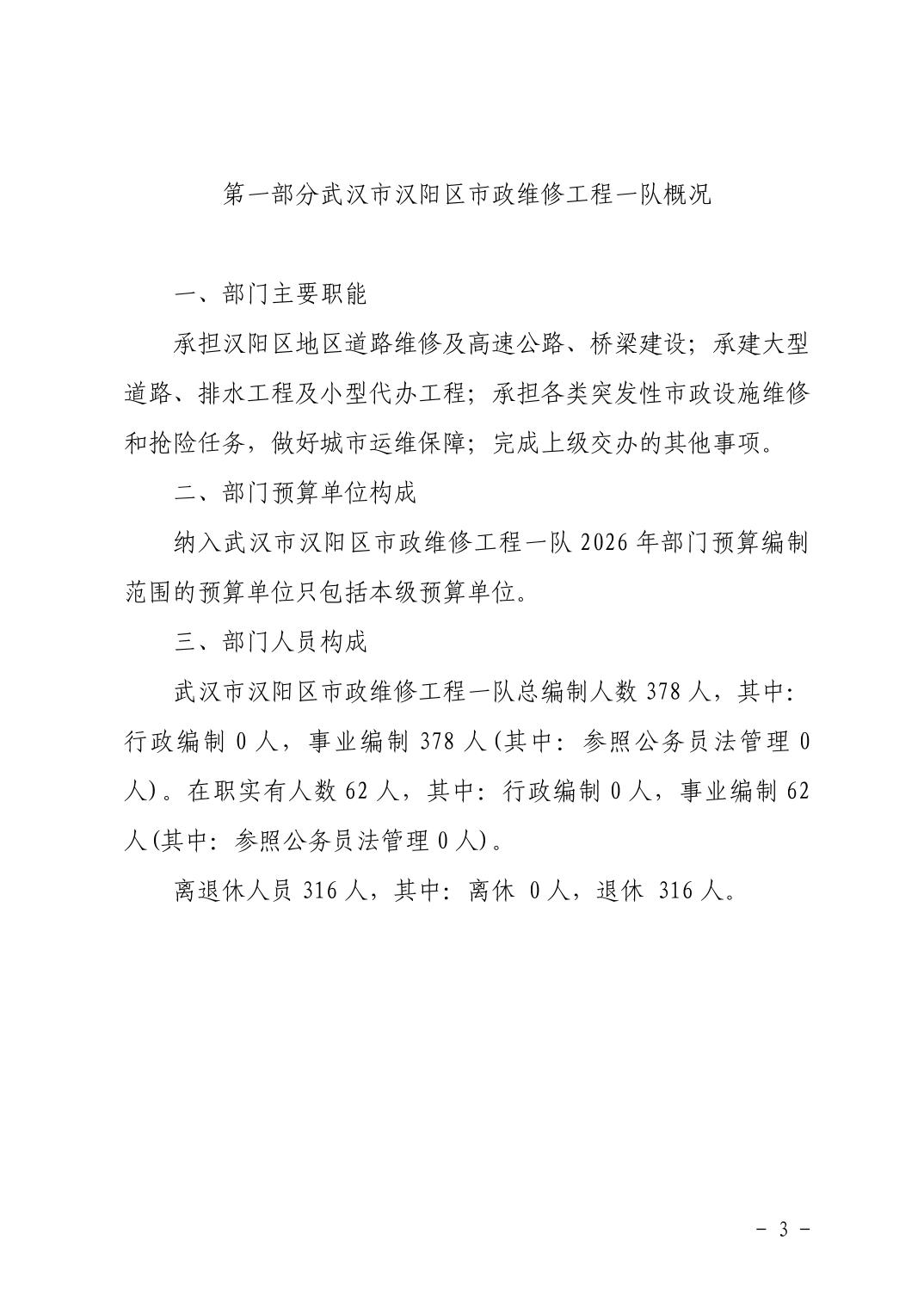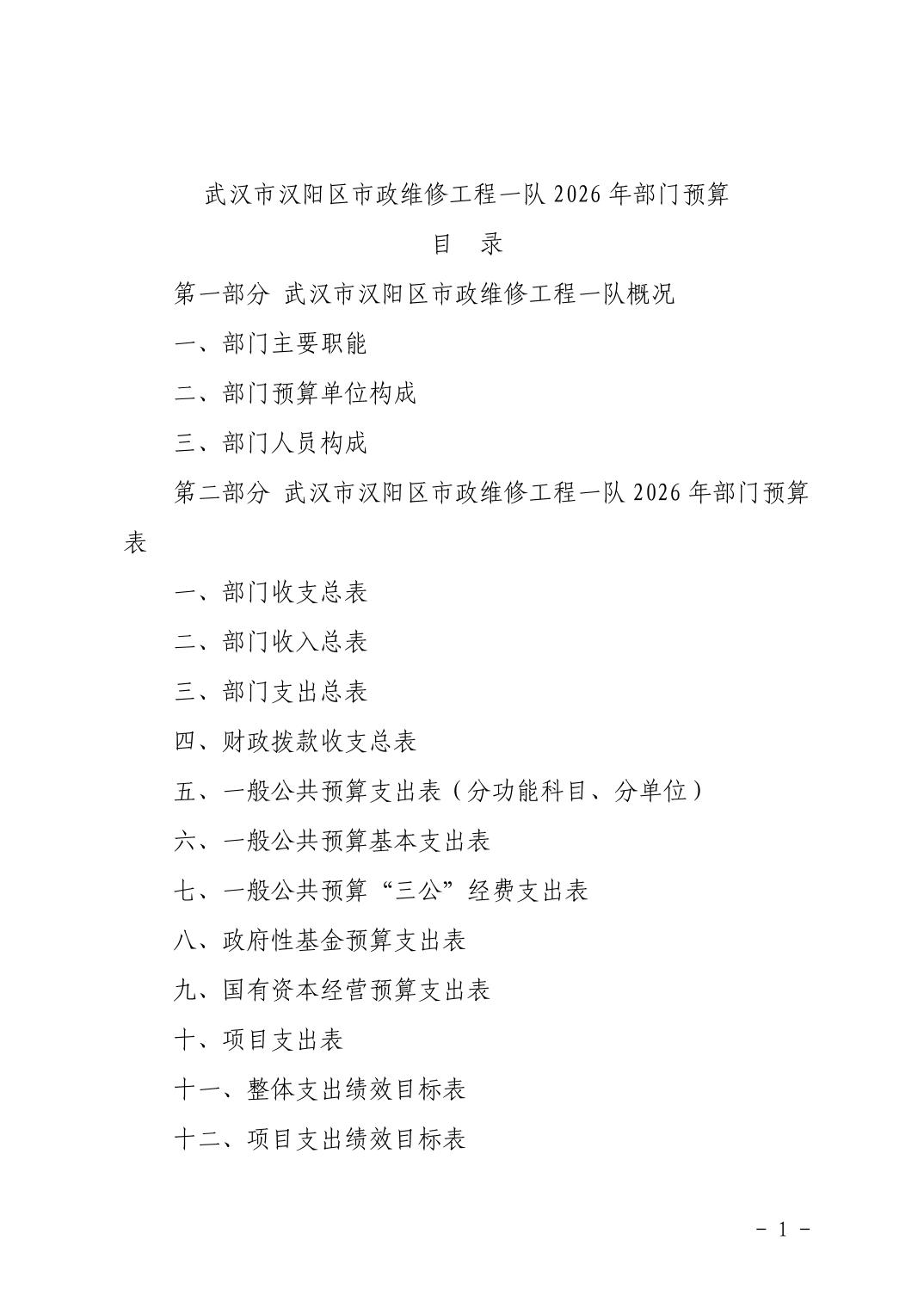 武汉市汉阳区市政维修工程一队2026年部门预算