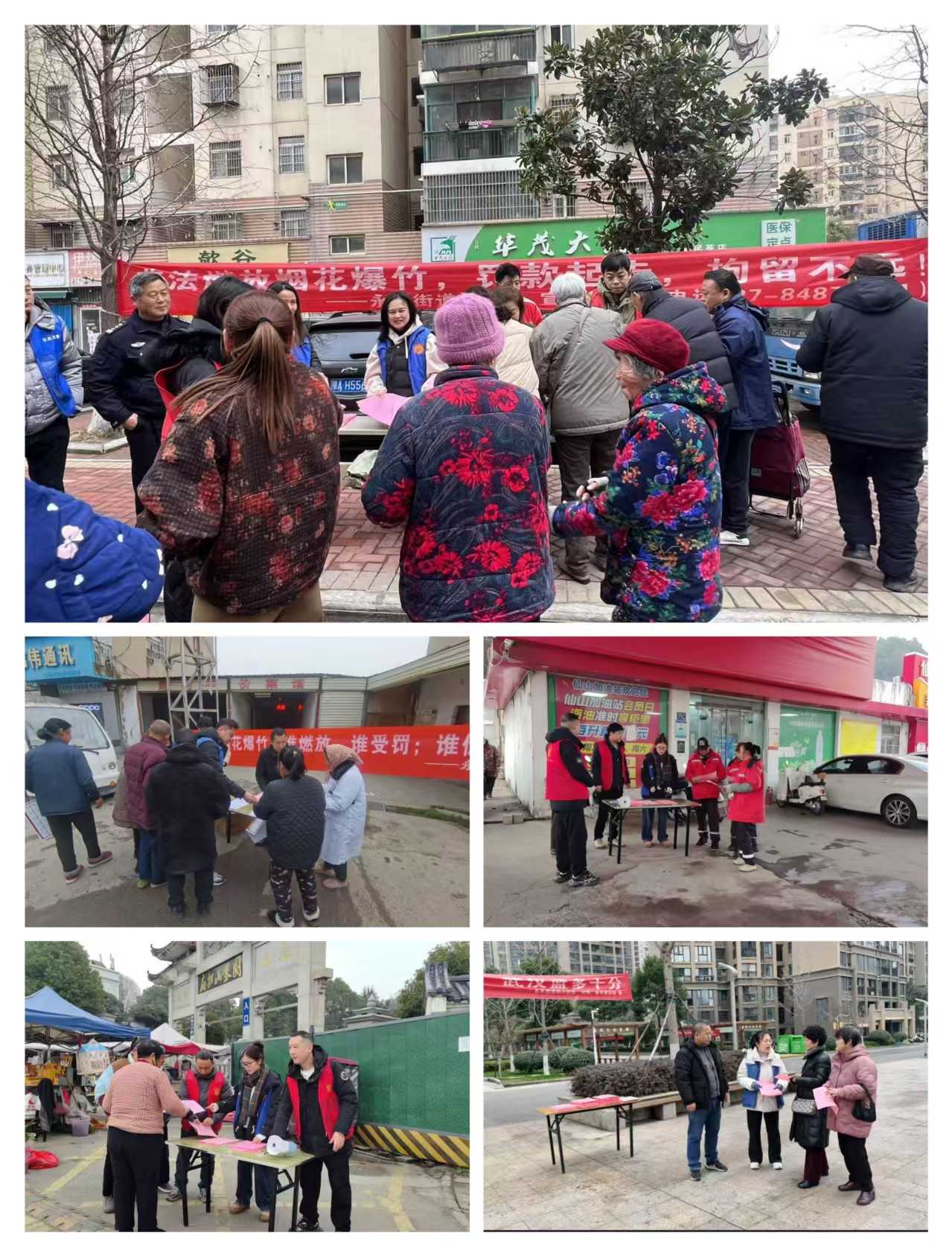 全区11个街道114个社区,全面发动社区民警、社区律师、社区工作者和网格员等基层力量,结合辖区人口分布、交通动线等实际情况,科学选址便民服务点、广场商圈、菜市场、小区出入口等人流密集区域设置宣传摊位,以“定点宣传+互动答疑”的形式,向过往居民发放禁鞭告知书。工作人员化身“安全宣传员”,面对面向居民解读《武汉市燃放烟花爆竹安全管理规定》,重点宣传全域禁鞭的政策边界、违规燃放的处罚规定和举报方式等,引导居民群众自觉遵纪守法,积极参与社会监督,自觉抵制涉鞭违法违规行为。街道社区还将禁鞭宣传融入迎春节庆活动、融于一氧化碳防范工作,全方位守护居民平安过节。