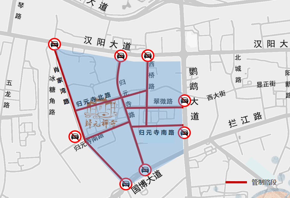 核心区域路段:2月16日(除夕)22:00至17日(初一)18:00、2月20日(初四)22:00至21日(初五)18:00,归元寺路、西桥路、翠微路、归元寺北路、归元寺南路、肖家湾路禁止机动车及非机动车通行和停放。