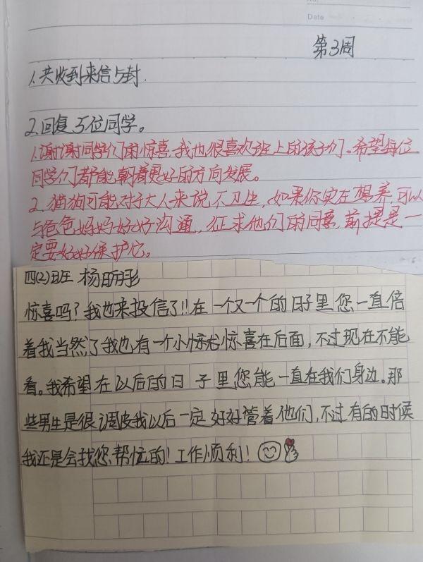 “写作文是个大困难,但办法总比困难多。平时多积累好词好句、多读美文,生活中多观察、思考、练笔,提高写字速度会更棒!”“踢球当然是件有益身心的事,老师大力支持。希望你每天将各科学习任务基本完成,再发挥所长,锻炼身体,就很棒了!”……班主任们根据孩子的来信以“悄悄话”“写回信”“班会讨论”“家校沟通”等方式为孩子们纾生活之忧、解成长之惑。