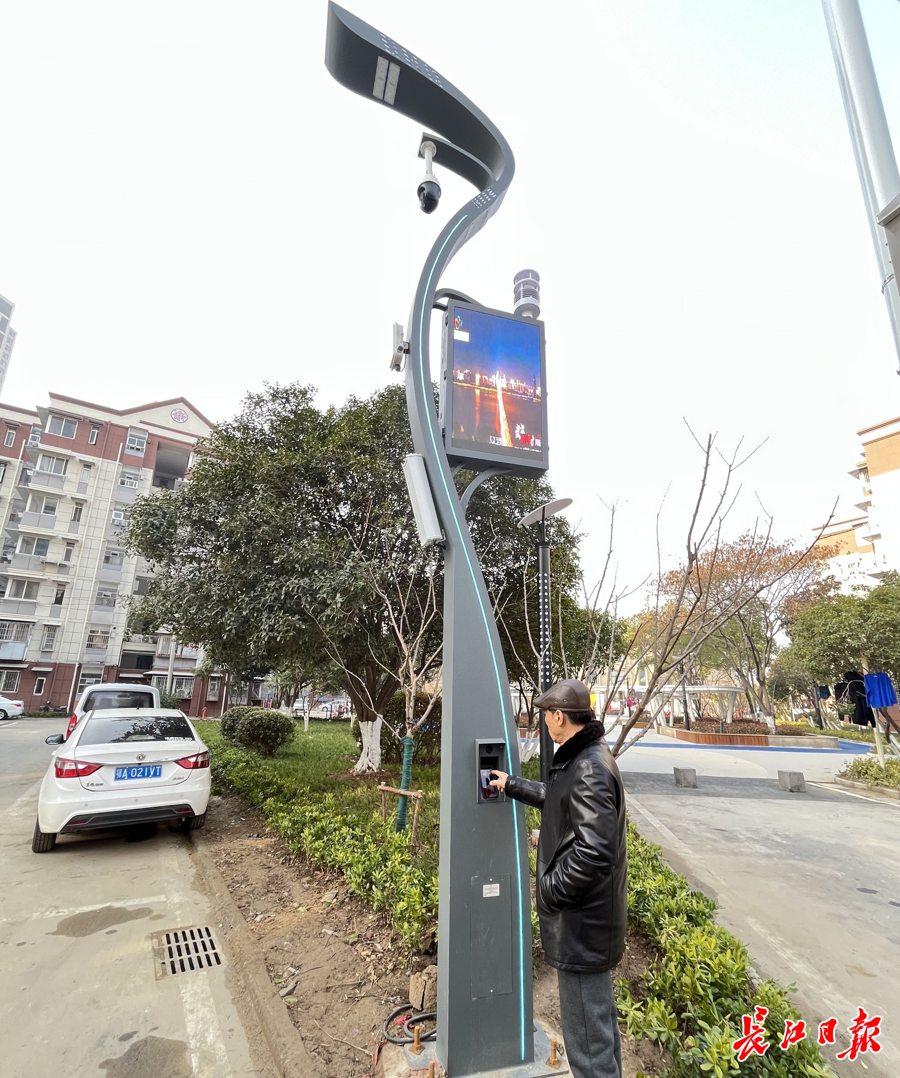 小区道路旁,居民魏顺新正在路灯杆下充电,灯杆上可以看见LED信息发布屏正在播放节目,杆身有充电台可为手机无线或有线充电,灯杆底部还融合了新能源汽车充电桩。魏顺新告诉记者,这是一款多功能智能路灯杆,还集合了太阳能供电、照明、环境监测、安防监控等功能。