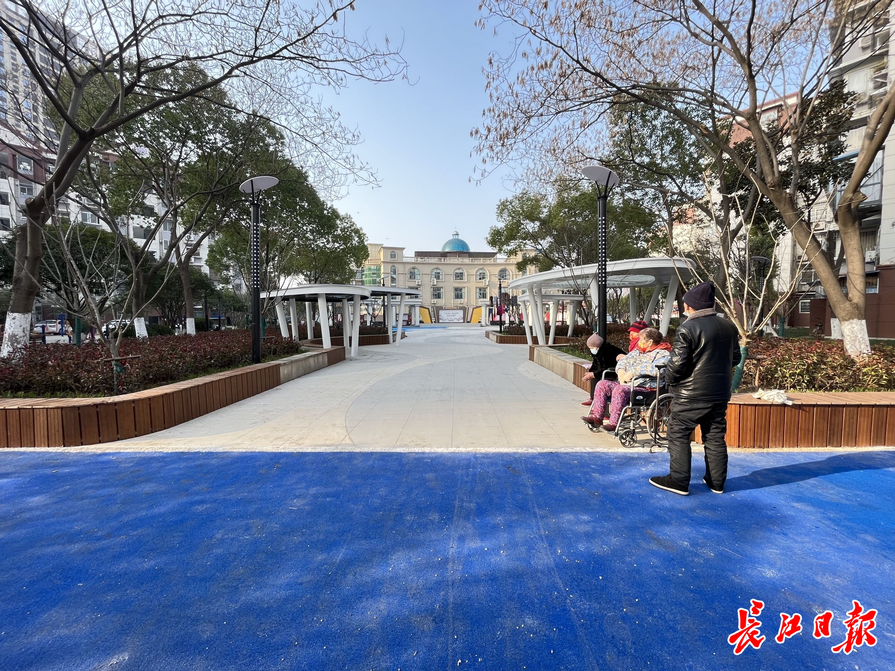 在刚改造完成的2700平方米“桃源溪谷”活动广场,记者看到,不少居民正在晒太阳聊天。广场入口处两边是桃花瓣形状的休闲亭,顶面采用镂空横梁配以玻璃的形式,既保证了透光,又能遮风挡雨。广场中央的地面上是一朵巨型桃花造型的浮雕图案,外围是一圈320米长的环形步道,四周种植了67株桃花树。