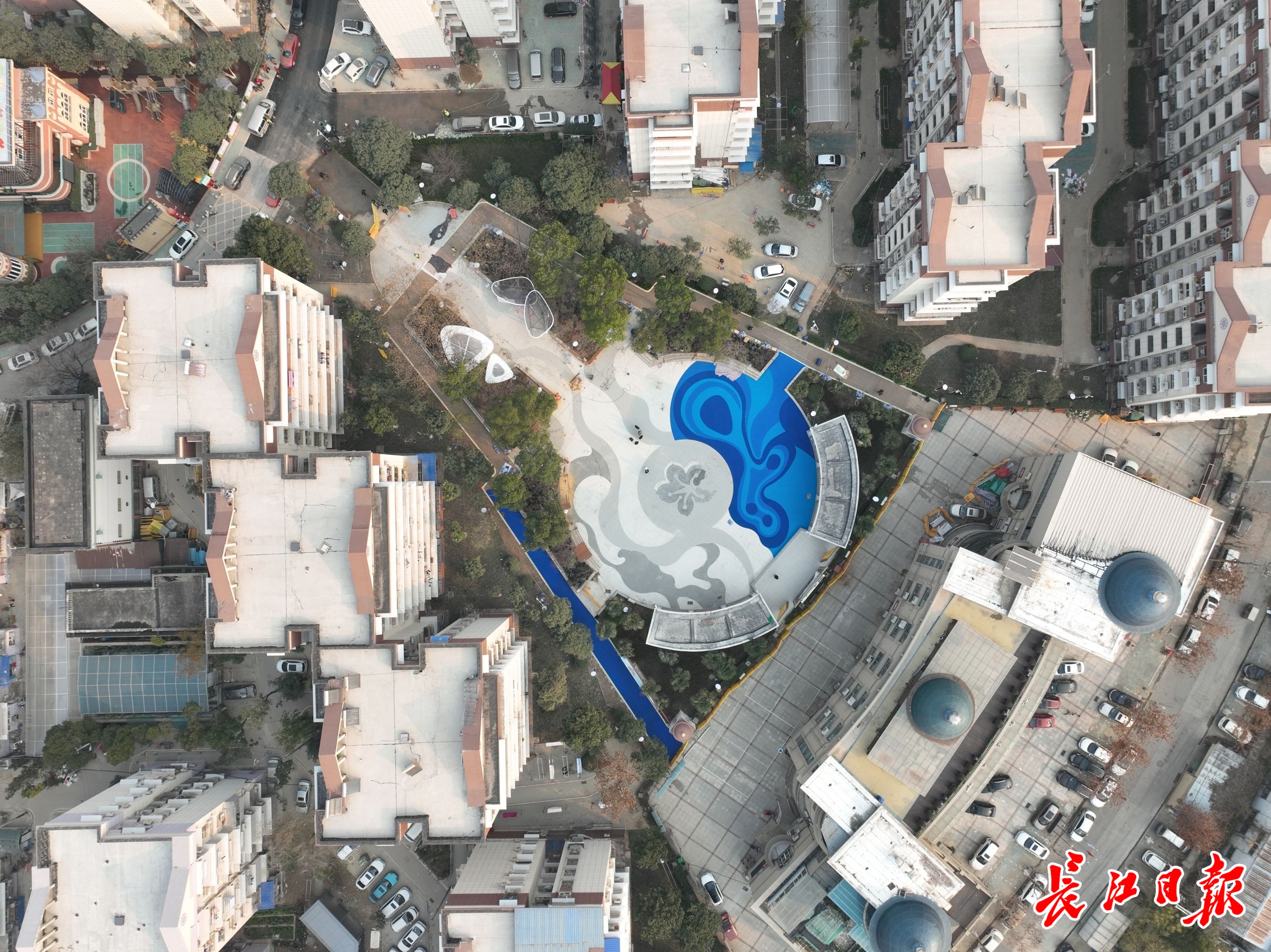 从空中俯视,可以看到“桃源溪谷”主题文体活动广场中央巨大的桃花造型。记者冷靖华 摄