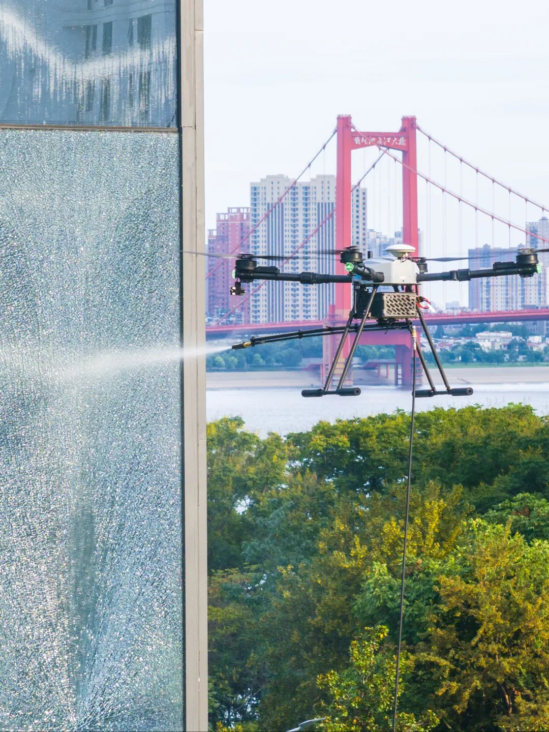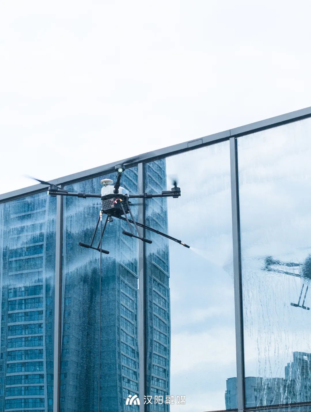 当天,在“武汉之眼”巨大的玻璃幕墙前,一架负载专业清洗模块的无人机起飞后稳稳悬停在百余米高空,水流精准冲刷着积尘。地面操作屏上,实时传回的影像则清晰显示着每一块玻璃的洁净度变化。
