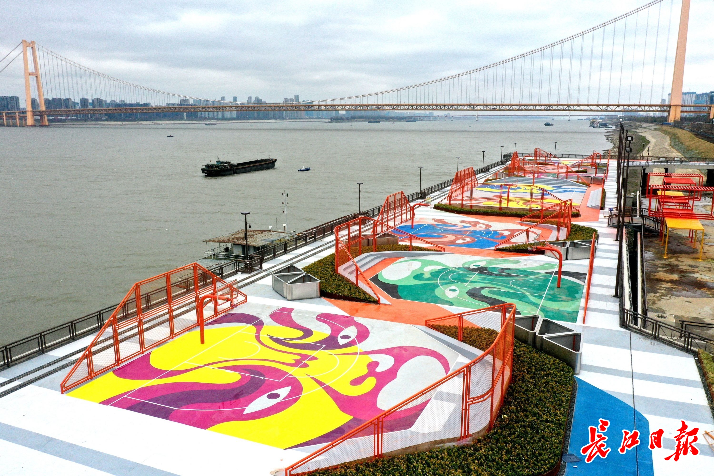 两江交汇的武汉从来都不缺少滨水景观,但杨泗港都市T台是唯一能让市民站在江面上感受江水奔腾的场所。市民丁先生说,从闸口进入一路走过来,感觉既熟悉又有新意,广场上的龙门吊、地上的航车轨道、围栏边的趸船都能让人想象到以往码头的繁华场景。而新建的国风篮球场、彩色集装箱建筑,又让人感觉新颖时尚,和武汉其他的江滩公园真的大有不同。