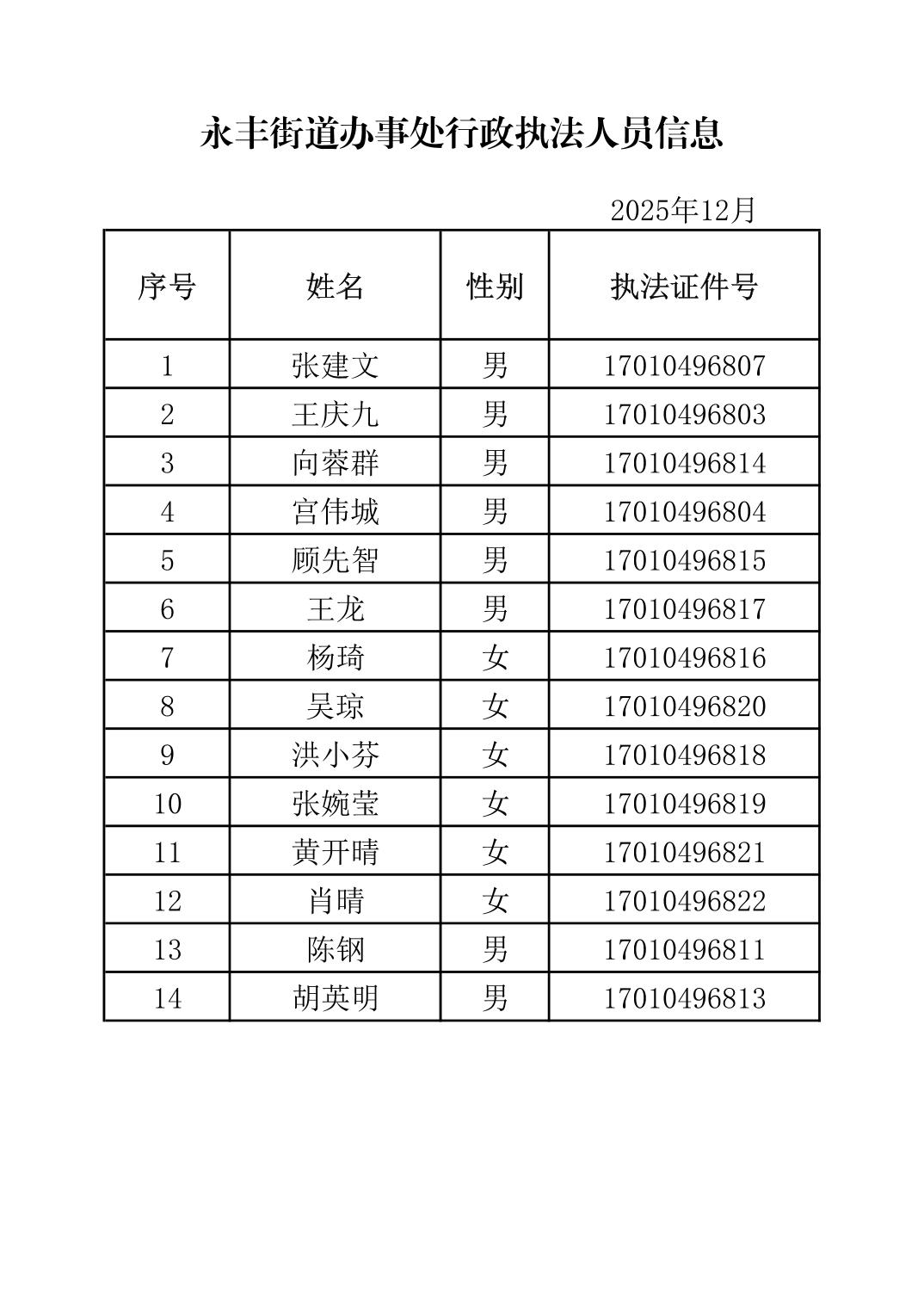 永丰街道办事处行政执法人员信息公示