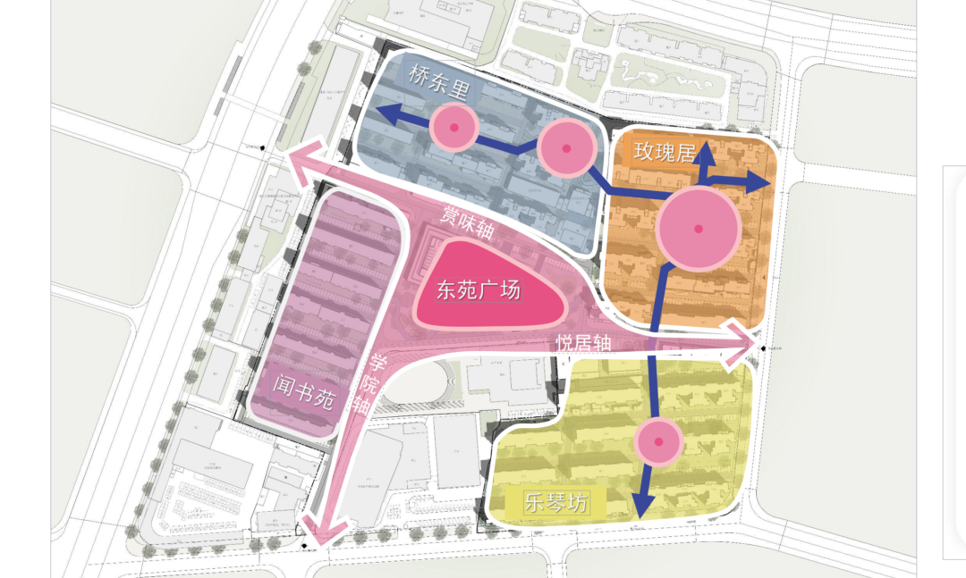 按照“一心、三轴、四片区”的改造规划布局,围绕小区中心的荟邻中心(东苑广场),整个知音东苑小区将划分为闻书苑、桥东里、玫瑰居和乐琴坊四个区域,并结合周边的玫瑰、汉江等元素进行不同颜色的外立面改造。