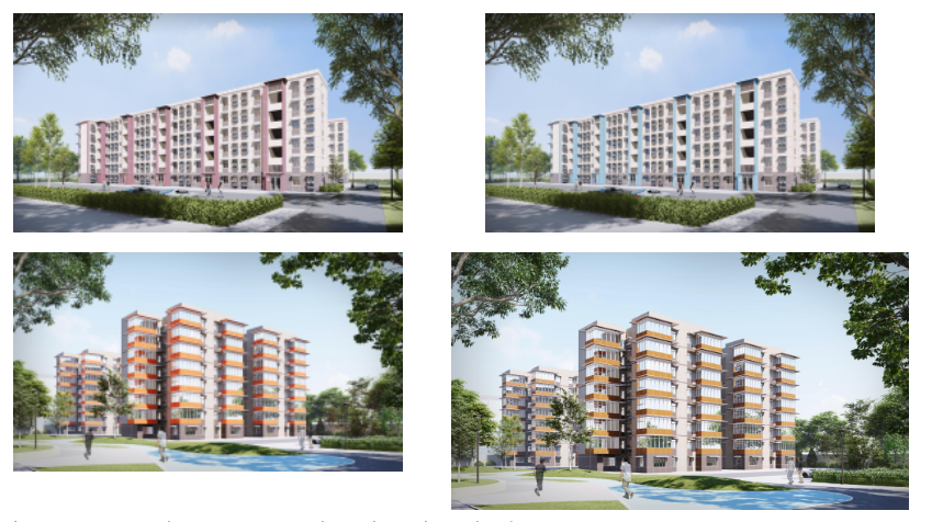 △知音东苑外立面改造,在四个区域,选取粉色、蓝色、橙色、棕色进行外立面改造