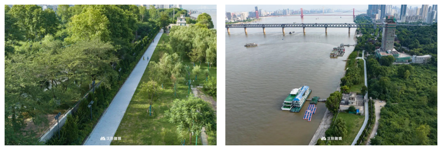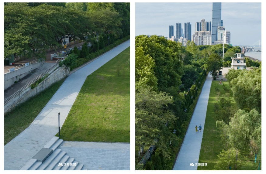 据了解,该路段是武汉市百里长江生态廊道建设南岸嘴节点的重点项目,工程范围起于晴川阁,止于南岸嘴公园,整个工程堤防长576m,景观建设总面积约11280㎡,其中绿化面积9966㎡,碧道改造面积1314㎡。工程不仅对破损路段进行了翻新拓宽,还在碧道与南岸嘴公园相交位置增设上下行坡道。