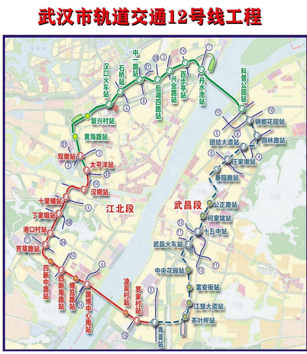 其中地铁12号线汉阳段设置有国博中心南站、博览路站、四新南路站、四新中路站、芳草路站、港口村站、丁家咀站、十里铺站、汉钢站等9个站点,串联起四新、王家湾、月湖等片区。可与4号线在十里铺站换乘,在国博中心南站与6号线、16号线换乘,并预留有与规划中的10号、11号、14号、24号、26号线换乘。