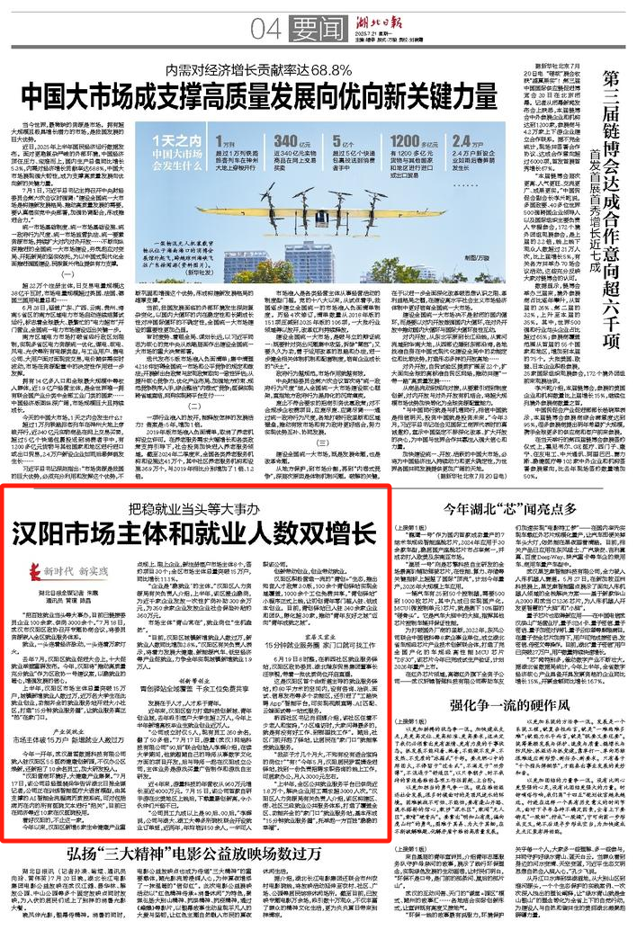 7月21日,湖北日报刊发《把稳就业当头等大事办 汉阳市场主体和就业人数双增长》一文,聚焦汉阳始终将就业创业作为最大的民生工程,以产业促就业、以创新带创业,多措并举健全就业服务体系,托举起一方百姓“稳稳的幸福”,推动经济社会高质量发展。