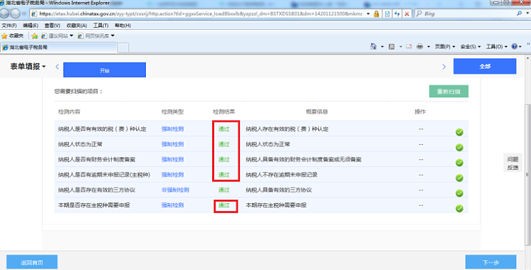 1、登录电子税务局,点击左侧常用功能菜单【综合申报】,系统自动进行扫描检测,确保所有强制检测类型必须是“通过”状态才能进入“下一步”进行申报,如图: