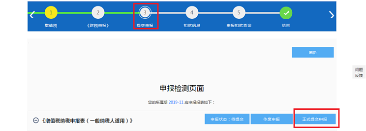 4、全部填写完成,进入【提交申报】,点击“正式提交申报”,提交成功后点击“票表比对”,进行比对(如比对不通过,请查看原因修改报表,否则影响清卡)。