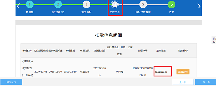 5、申报成功后,如您签订了三方协议,则可以线上扣款:点击【扣款信息】,点击“扣款”按钮,扣款信息显示“已成功扣款”,则完成扣款。