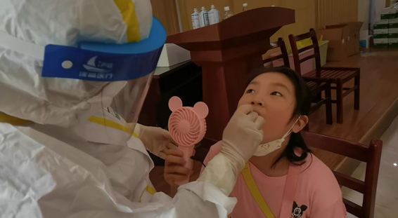 核酸检测时,武汉一位小学生向护士举起了风扇。通讯员黄鲲 供图