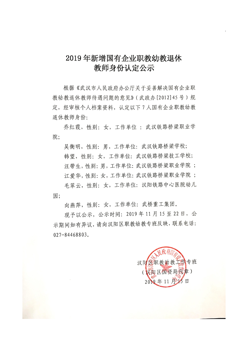 2019年国有企业职教幼教退休教师身份认定公示