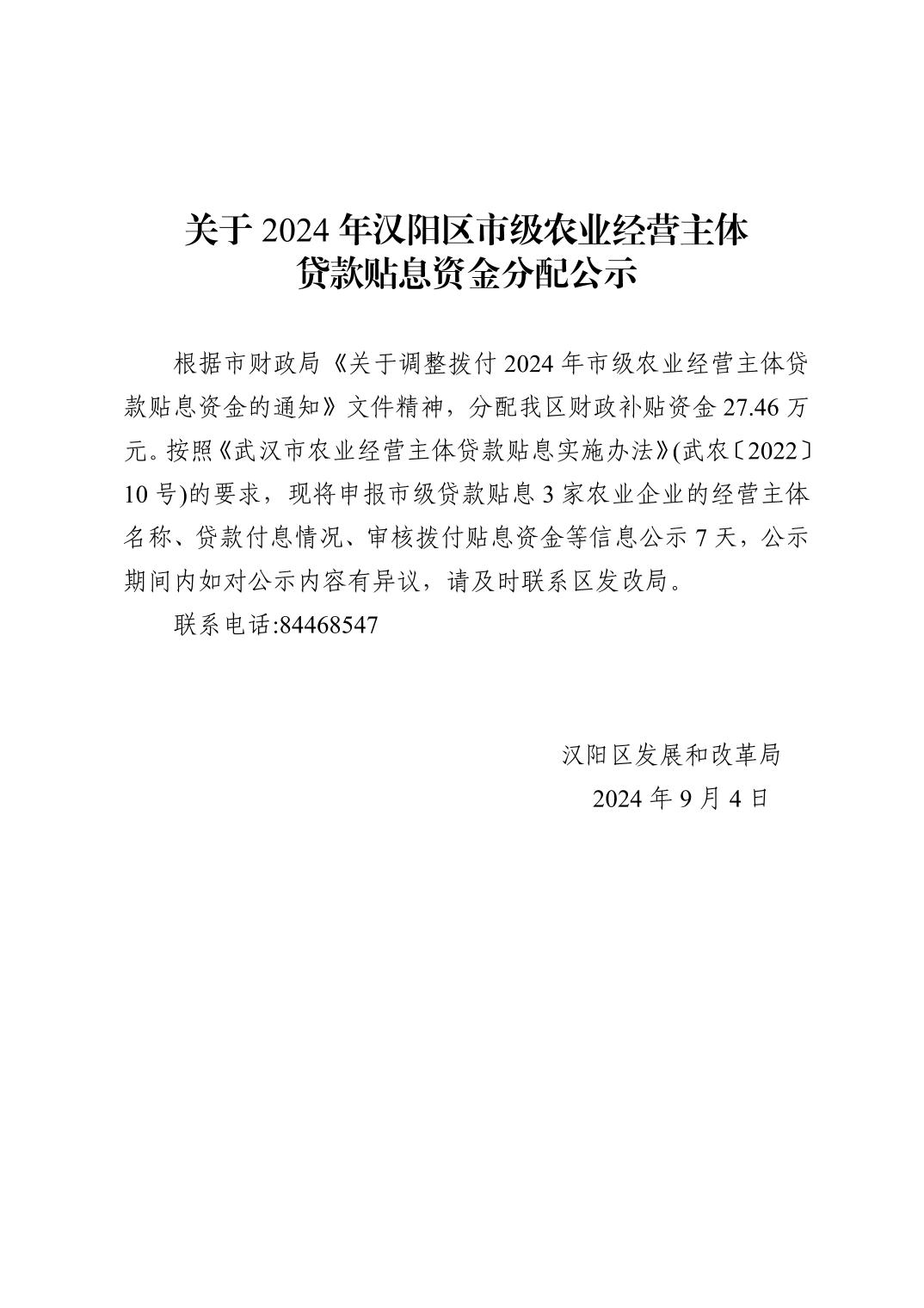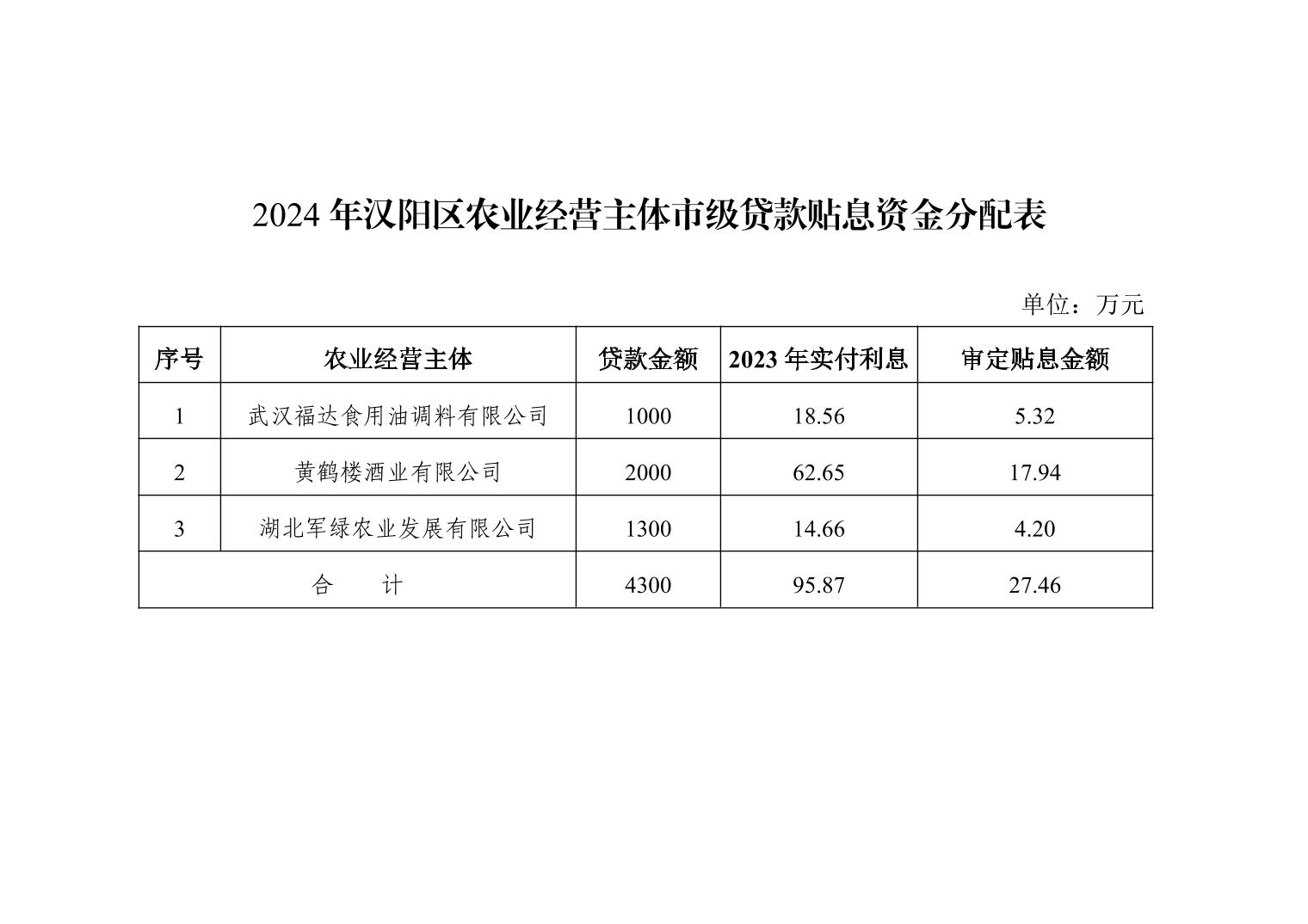 2024年汉阳区农业经营主体市级贷款贴息公示