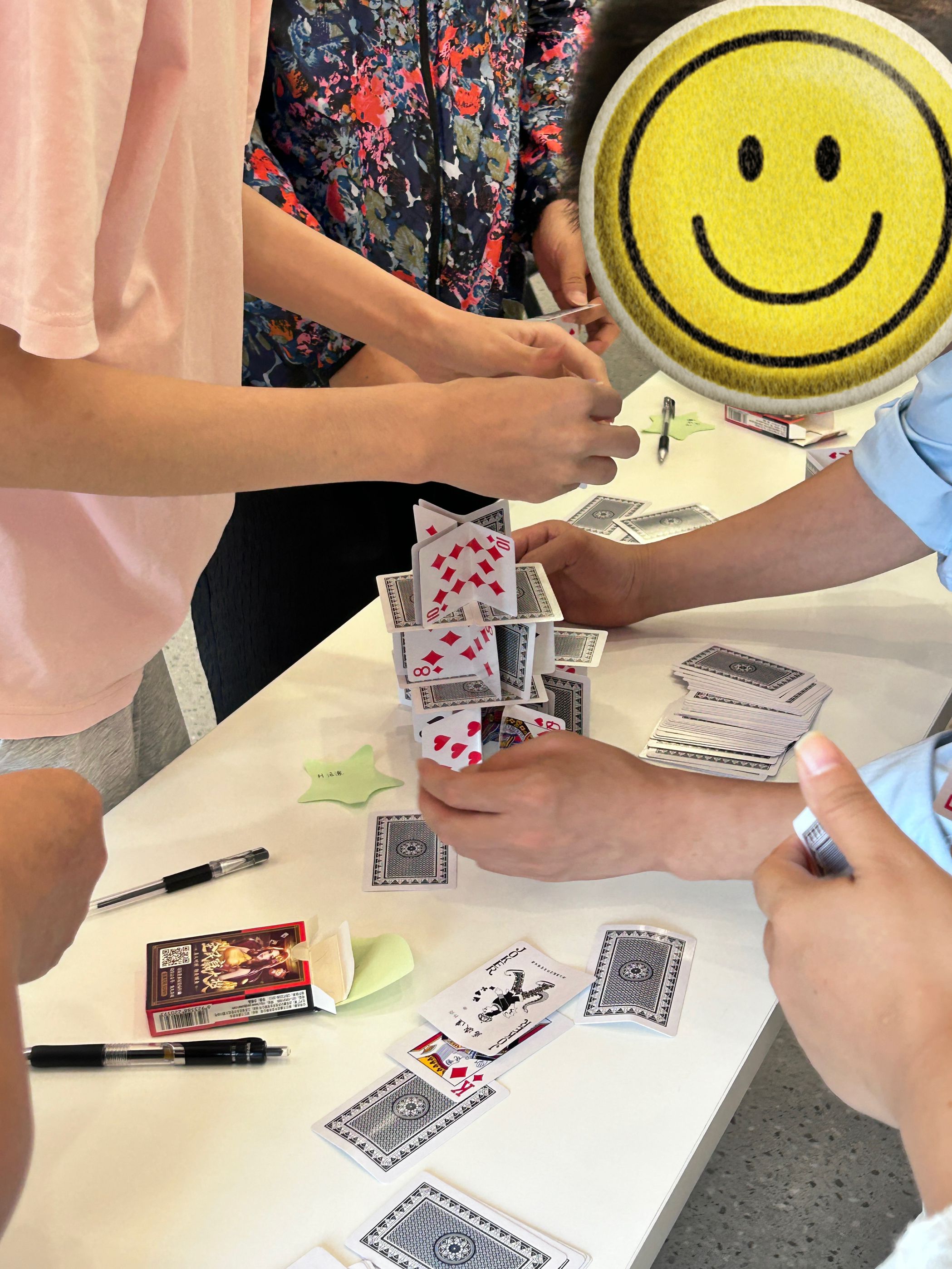 随后,心理老师组织开展了名为“高楼大厦平地起”的团建活动,将40名学员随机分为6个小组,各小组需用100张扑克牌搭建象征“人生重建”的建筑模型。活动初期,一些小组由于彼此陌生而发生争执,有的因急于求成导致模型屡次倒塌,还有的小组出现仅个别组员参与、多数人“躺平”的现象。罗老师及时发现问题并介入引导,逐渐每个小组都摸索出有效的协作方式。其中表现最突出的两个组分别采用了“底层加固——分层递进”策略和“轮流创意——全员表决”机制,协作效果尤为显著。学员们通过一次次调整与加固,切实体会到团队中沟通、分工与坚持的重要性,也在共同克服困难的过程中,打破了彼此之间的隔阂,增强了集体凝聚力。