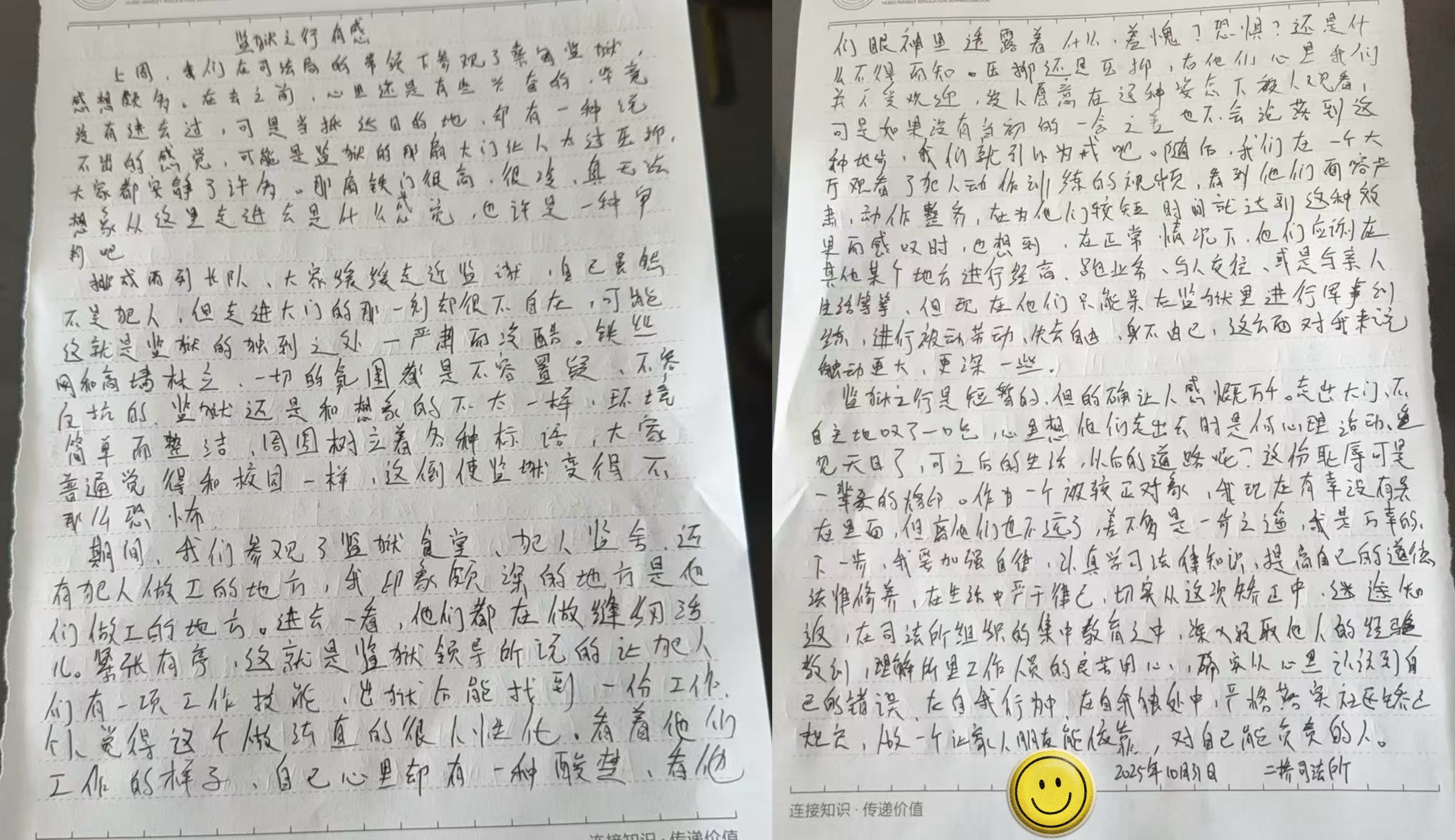 汉阳区社矫局组织社区矫正对象前往蔡甸监狱开展实地警示教育。矫正对象通过参观服刑人员监舍、食堂、劳动改造车间,观看警示教育专题片,近距离感受服刑人员的改造生活,直观体会“高墙内外”的巨大差异。身临其境的体验让矫正对象在思想上受到深刻洗礼,在心灵上产生强烈震撼。建桥司法所社区矫正对象吴某(化名)在参观后表示:“此次经历让我刻骨铭心,今后会始终把警钟放在心里,好好把握改过自新的机会。”二桥司法所社区矫正对象李某(化名)也在参观后表示:“相较于监狱里的他们,我是幸运的,下一步,我要加强自律,认真学习法律知识,珍惜机会。”