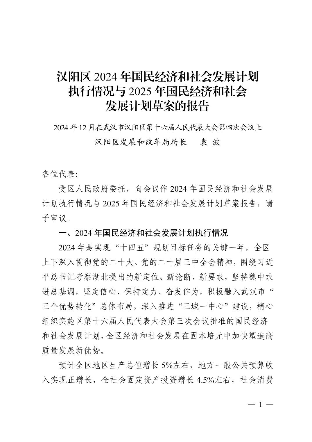 汉阳区2024年国民经济和社会发展计划执行情况与2025年国民经济和社会发展计划草案的报告