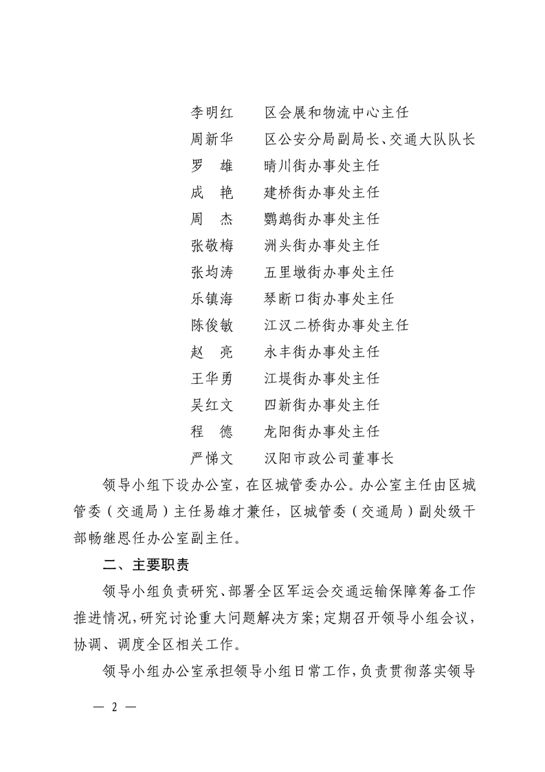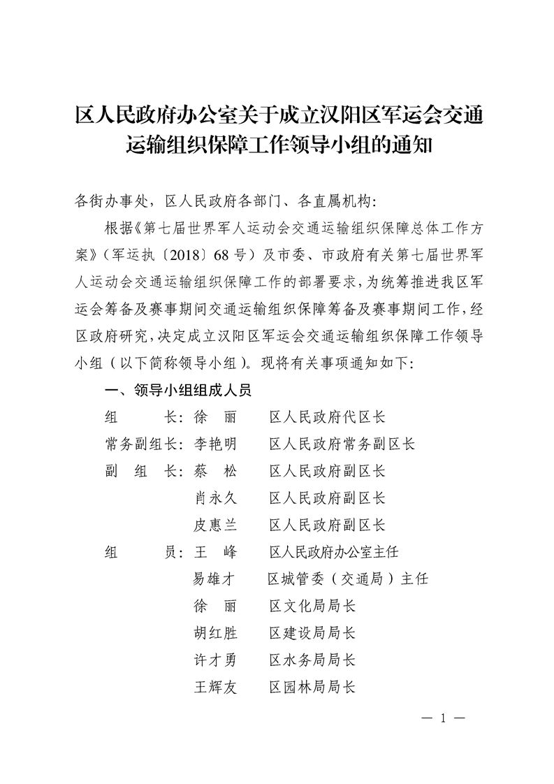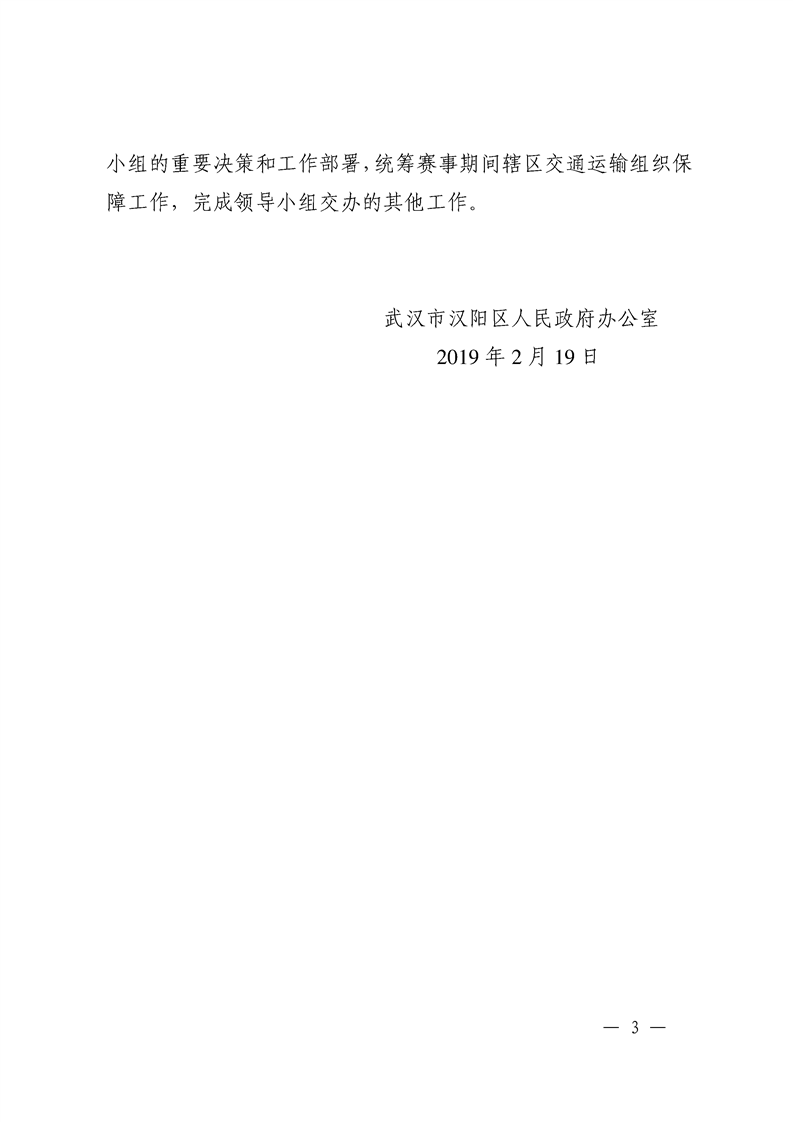 阳政办〔2019〕3号—区人民政府办公室关于成立汉阳区军运会交通运输组织保障工作领导小组的通知